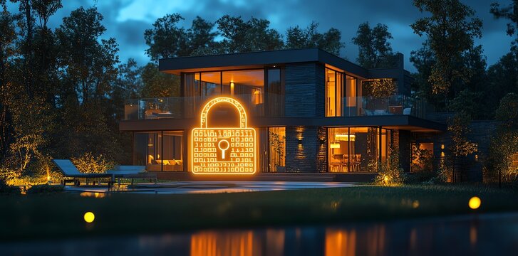 Modern house at night illuminated with a glowing padlock graphic symbolizing home security Perfect for illustrating home safety and technology