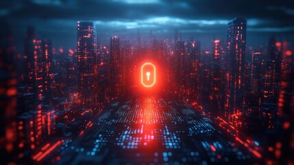 Futuristic Digital Landscape with Glowing Padlock and Binary Code Background in Cyberpunk Style