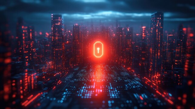 Glowing red lock icon standing on a digital network grid symbolizes cybersecurity data protection. The illustration depicts the digital landscape and the importance of safeguarding information.
