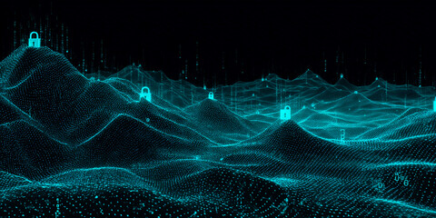 Abstract teal digital landscape with padlock icons symbolizing cybersecurity, data protection, and network security