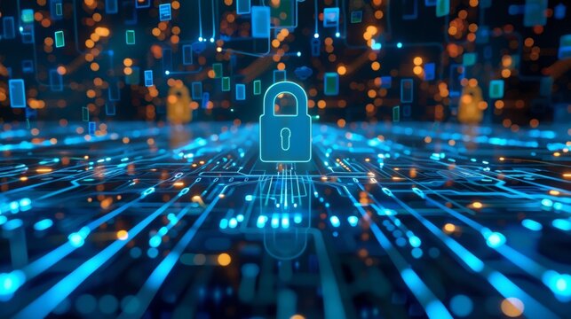 Glowing padlock rests on a futuristic circuit board, symbolizing digital security and data protection in cyberspace. This tech concept represents safeguarding information.