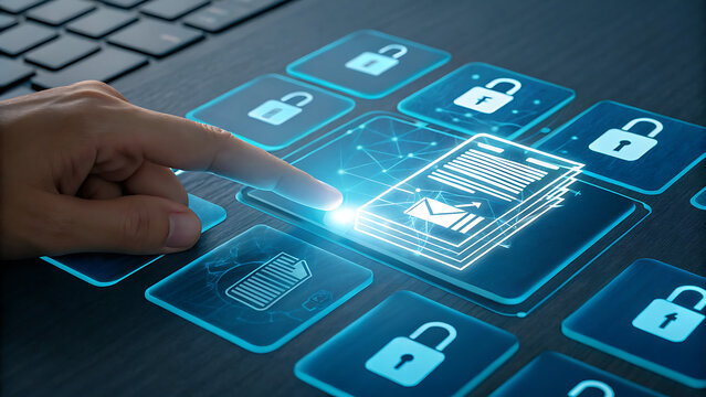 A persons finger hovers over a digital document icon surrounded by security icons, symbolizing data protection and cybersecurity measures