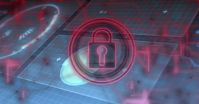 Digital Padlock Overlaying Complex Cybersecurity Interface Images