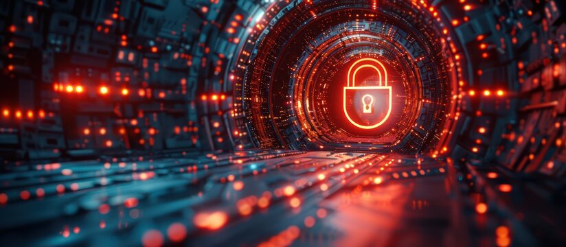 Neon glowing padlock icon in a futuristic tunnel, representing cybersecurity, data protection, and network security.