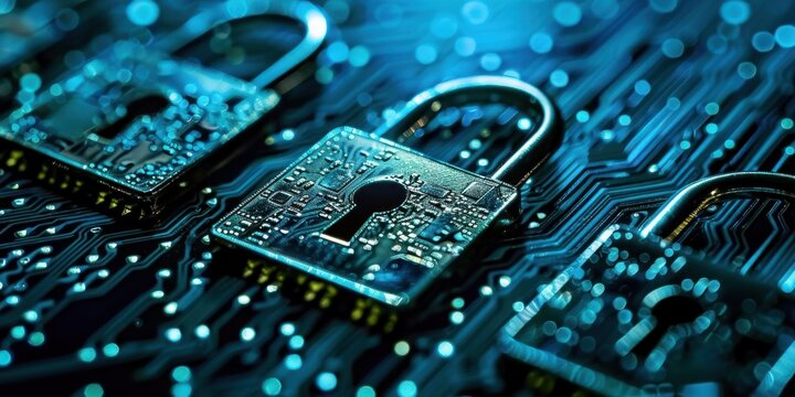 A computer circuit board with a padlock on it, set against a blue and green background with a blurred, bokeh effect.