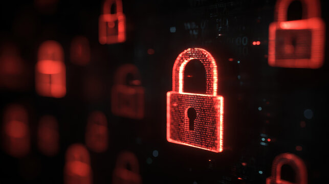 Cybersecurity digital lock data protection network security cyber defense encryption firewall risk safety privacy glowing red padlock symbol over