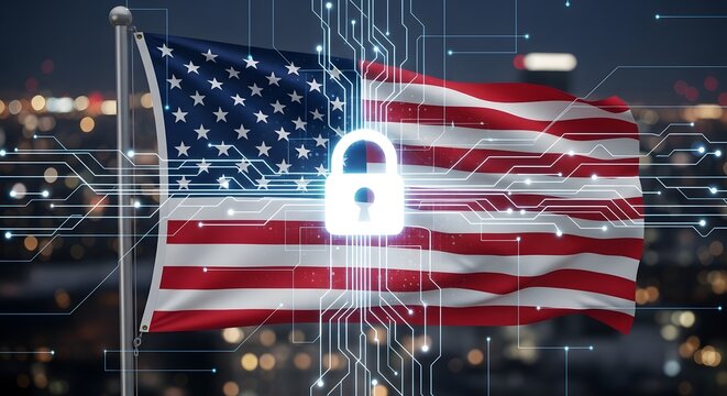 USA Cybersecurity Concept – Padlock Over American Flag with Digital Security Overlay