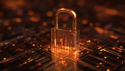 Glowing digital padlock symbolizes cyber security over a complex network of illuminated circuits
