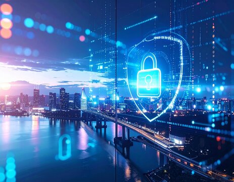 Cybersecurity protecting smart city infrastructure. Digital shield with padlock icon on a futuristic urban landscape, symbolizing secure networks and data