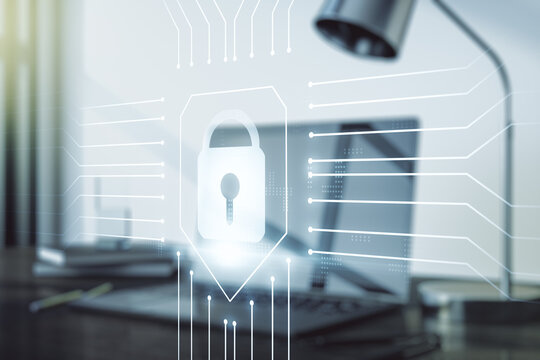 Double exposure of creative lock hologram with chip on laptop background. Information security concept