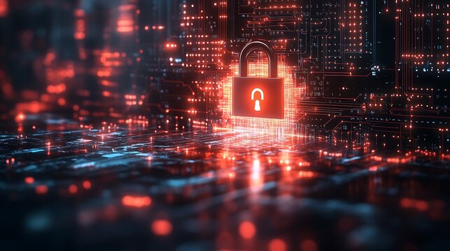 Glowing cybersecurity lock with digital data patterns