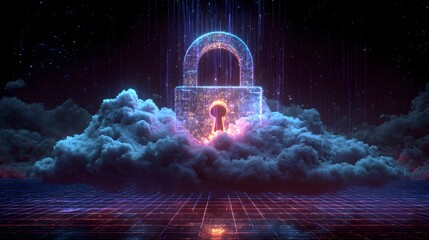 Futuristic glowing padlock symbolizing cloud data security and encryption
