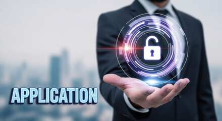 A businessman in a suit presents a virtual open padlock with futuristic purple light effect above his palm in the city, symbolizing digital security.