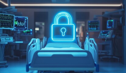 Neon padlock hovers over hospital bed, symbolizing patient data security.