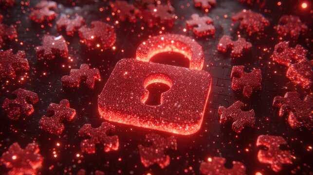 Glowing red padlock with scattered puzzle pieces symbolizes security and problem-solving.