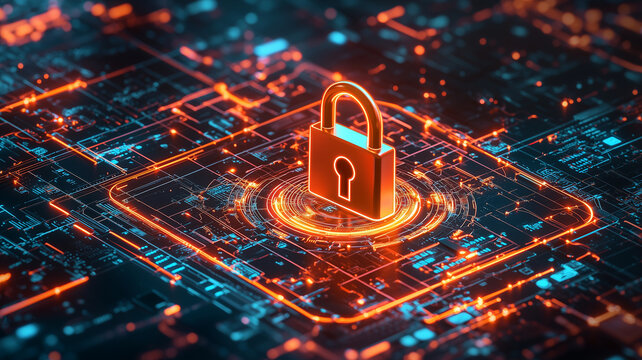 glowing padlock symbol surrounded by digital circuits and vibrant lights represents cybersecurity and data protection. This conveys sense of security in technological environment