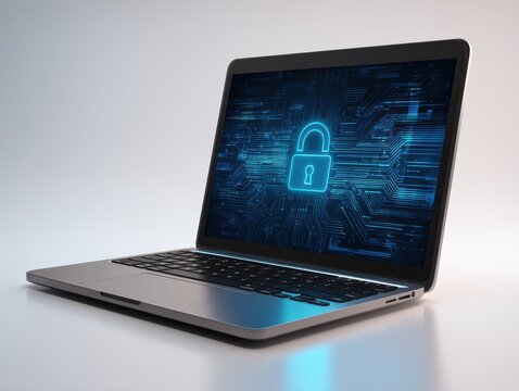 A laptop displays a glowing digital padlock icon, symbolizing cybersecurity and data protection in a modern technological environment