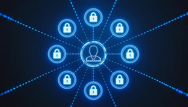 Digital Fortress: A network of secure padlocks converging towards a central figure, symbolizing the intricate web of digital security in the digital age.