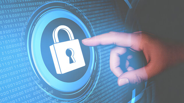 A glowing digital lock surrounded by streams of binary code and data points, symbolizing cybersecurity.
