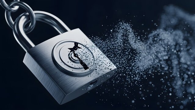 Security Breach: A close-up shot of a chrome padlock being shattered into pieces, symbolizing the vulnerability of digital security in our connected world.
