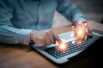 Laptop keyboard running biometric fingerprint scan with holographic cybersecurity overlay and red mu