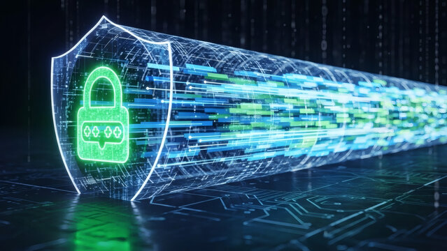A neon green padlock on a transparent shield protects a digital data stream of blue and green light flowing over a reflective circuit board pattern