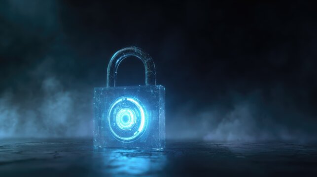 glowing blue padlock with a hud interface on a dark background with fog symbolizing cybersecurity and data protection for cybersecurity awareness month
