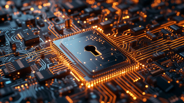 A glowing padlock icon sits atop a circuit board