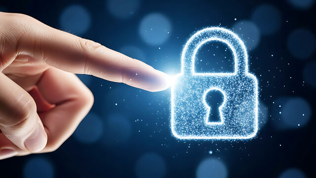 A hand touching a glowing digital padlock on a dark background with blue lights