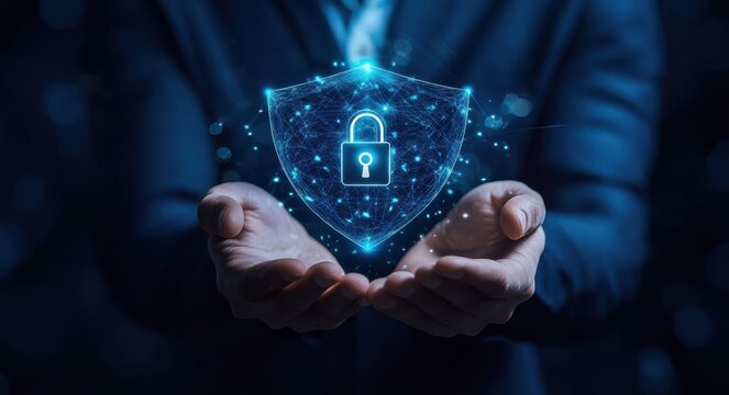 Digital shield and padlock symbolizing cybersecurity network
