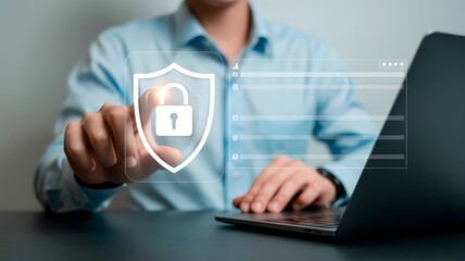 Person touching a digital shield with a padlock icon on a virtual interface near a laptop cybersecurity