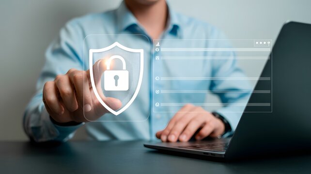 Cybersecurity concept with digital lock shield overlay on laptop user