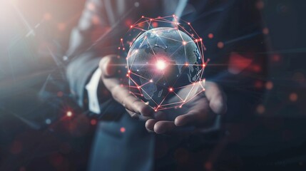 Business Professional Holding Holographic Globe Global Network Data Analysis and Cyber Innovation