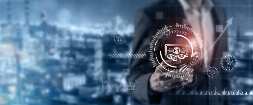 Digital finance, Fintech concept. Using the internet mobile app for transactions in online financial and banking systems. Businessman using mobile smartphone on global financial networks.
