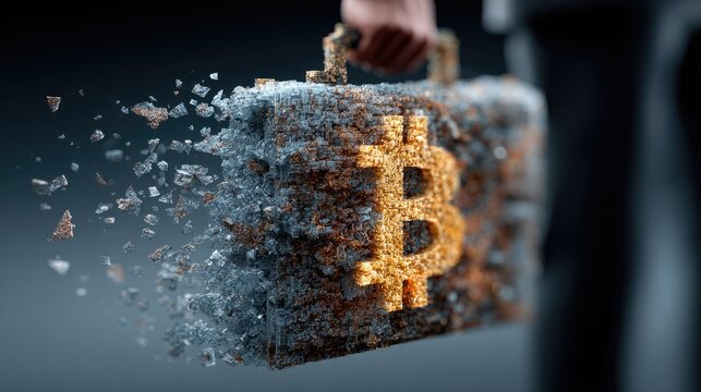 Futuristic image of a fragmented briefcase with a glowing Bitcoin symbol, symbolizing digital currency innovation and blockchain technology.