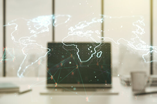Abstract creative world map on modern laptop background, international trading concept. Multiexposure