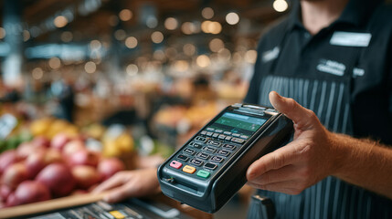 A man is holding a credit card reader in a grocery store. Concept of convenience and modernity, as the use of electronic payment methods is becoming increasingly popular in retail settings