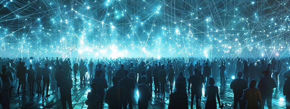 large crowd of people connected by glowing lines of light in communication and networking effect, demonstrating the power of digital technology