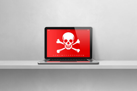 Laptop on a shelf with a pirate symbol on screen. Hacking concept