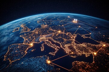 Satellite network connecting Europe. Global tech infrastructure. Satellite in low earth orbit. Light beams connect cities. Night view of Europe. Tech innovation. Global communication. Space tech.