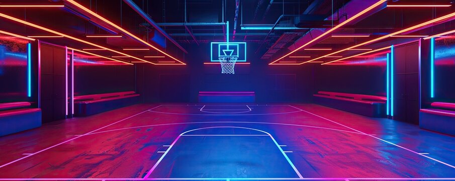 Neon lights flash on the basketball court. Futuristic background.