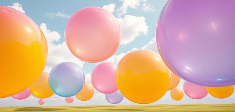 Oversized translucent rainbow balls float in a pastel sky, creating a whimsical playground  ,  happy,  playground