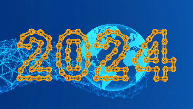 Map of the planet. World map. Global social network with 2024 Happy New Year made by golden bicycle chain links