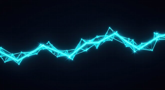 A glowing cyan polygonal line chart on a dark grid background. The abstract design visualizes data trends with interconnected nodes and vibrant lines.