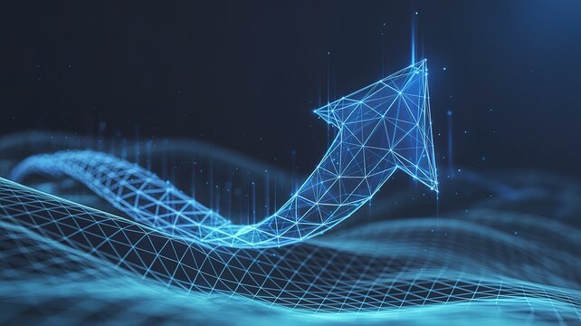 A glowing blue arrow ascends, formed from interconnected nodes, symbolizing growth and progress in a dark background.  The design uses a polygonal, low-poly style.