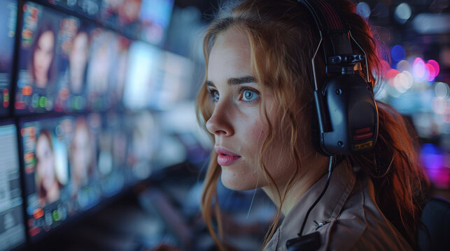 In a modern office, a young woman monitors security cameras, maintaining control over digital surveillance systems