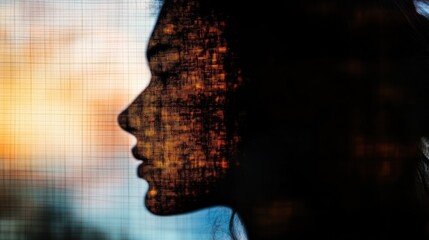 Digital Sunset Silhouette Womans Face, Grid Pattern, Orange Glow
