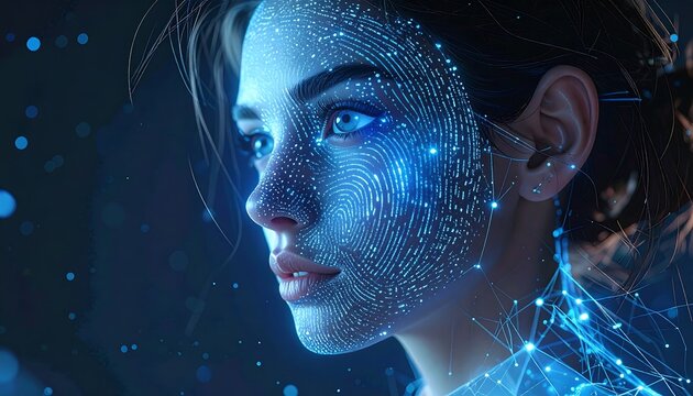 Abstract female profile, digital art, glowing particles, bokeh background