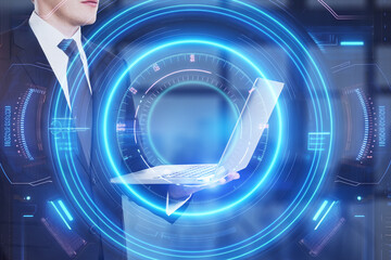 A businessman with futuristic blue digital overlays around him on a dark background, symbolizing technology and growth. Generative AI