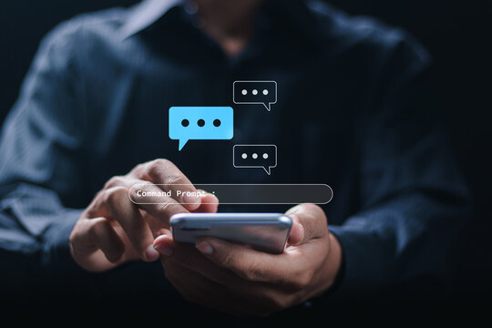 Ai technology concept, Businessman use smartphone with technology Internet connect Chatbot Chat with AI, robot application, conversation assistant, using command prompt for generates something.